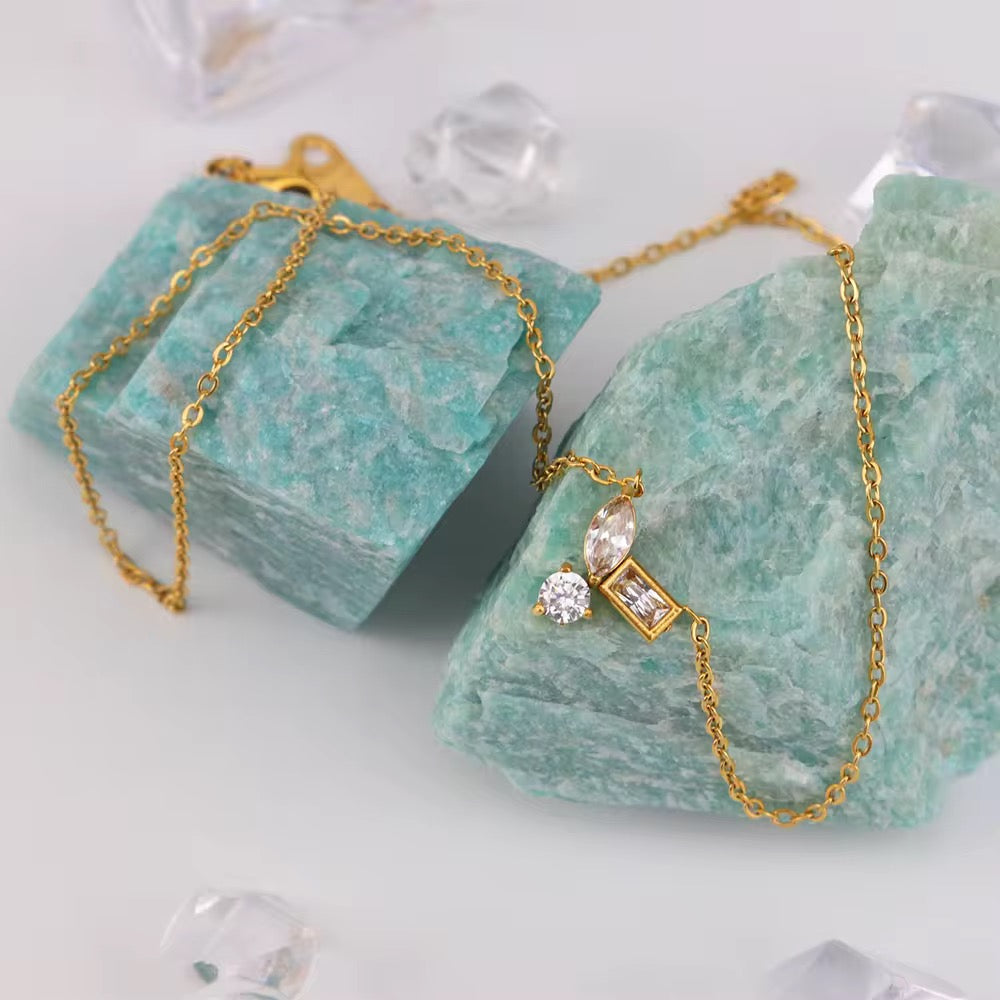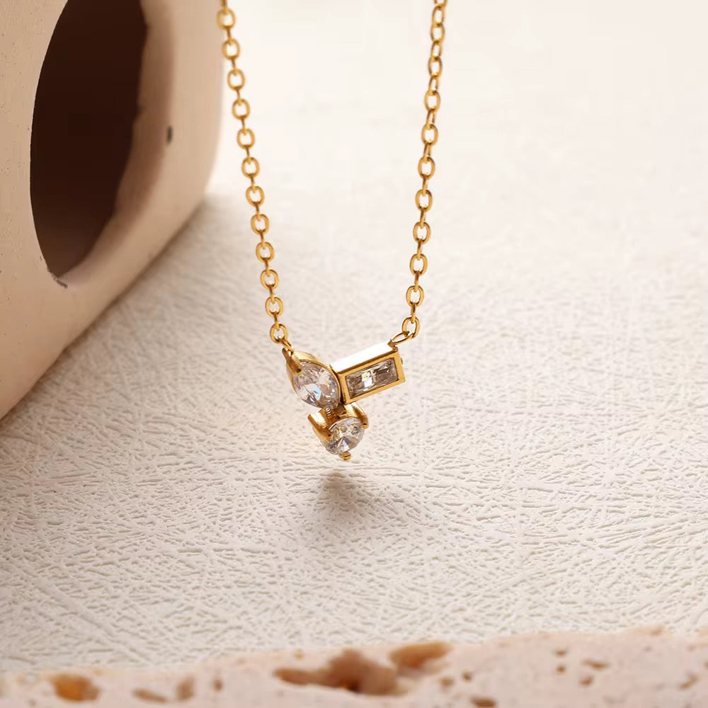 Product Description: A minimal yet striking pendant featuring geometric-shaped cubic zirconia stones set on a dainty gold chain. Designed for everyday wear, this necklace adds a refined sparkle to your neckline.