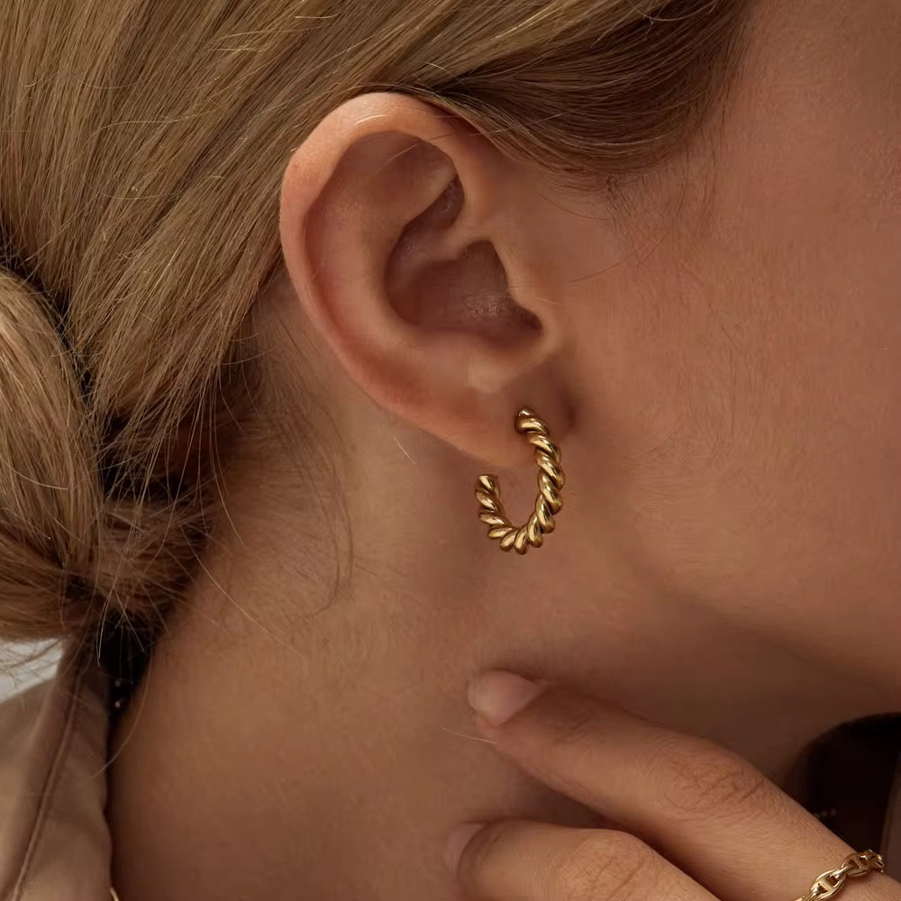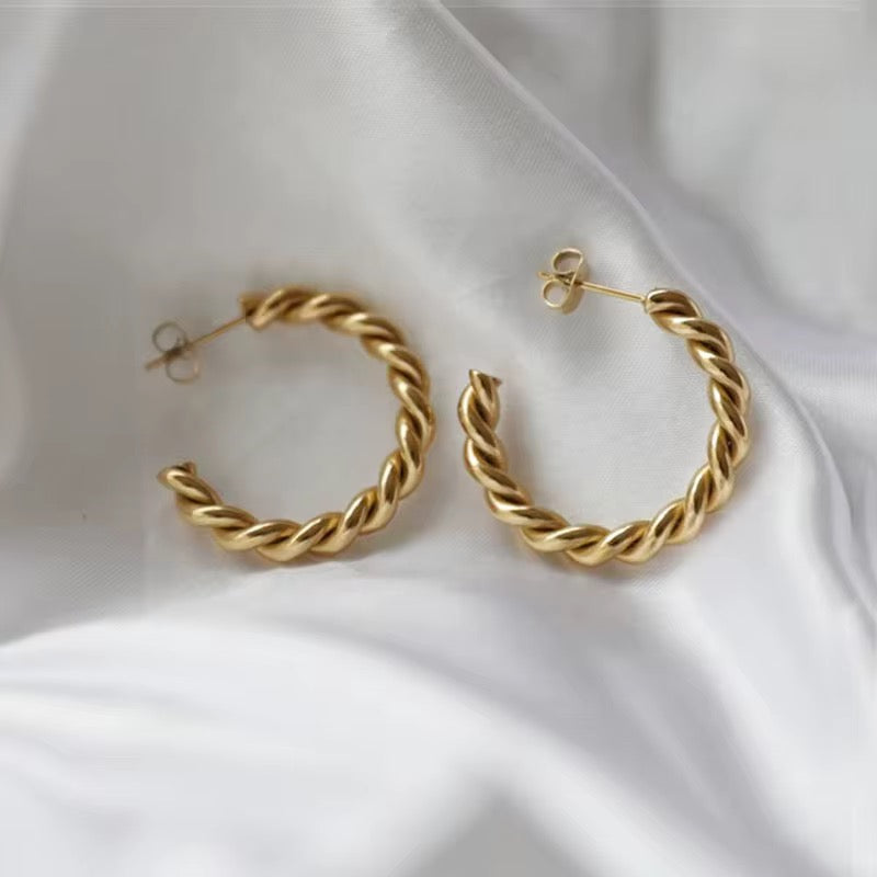 Product Description: Crafted with a modern twist, these gold hoops feature a rope-inspired design that adds subtle texture to your everyday look. Elegant and versatile, they’re perfect for styling from workwear to casual outings.